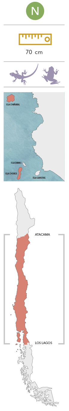 Referencias:DONOSO-BARROS R (1966) Reptiles de Chile. Ediciones Universidad de Chile, Santiago, Chile. cxliv + 458 pp.