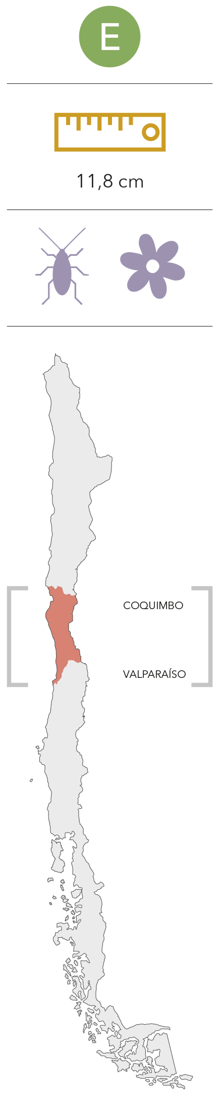 Distribución:Esta especie, endémica de Chile, presenta un rango de distribución en el matorral costero desde Quebrada Los Choros (Región de Coquimbo) a Zapallar (Región de Valparaíso), con una distribución que va desde el nivel del mar hasta los 800 msnm; interesante es nuestro registro en la Isla Chañaral (Reserva Nacional Pingüino de Humboldt, Región de Atacama), debido a la presencia de una coloración no descrita anteriormente.